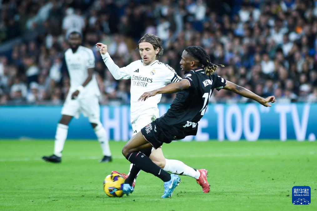 3月29日,皇家马德里队球员莫德里奇(左)和莱加内斯队球员内尤在比赛中拼抢。新华社发(古斯塔沃·巴连特摄)