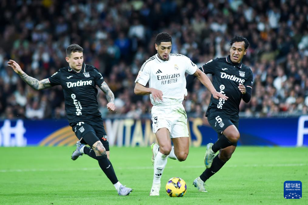 3月29日,皇家马德里队球员贝林厄姆(中)和莱加内斯队球员拉巴(左)、塔皮亚在比赛中拼抢。新华社发(古斯塔沃·巴连特摄)