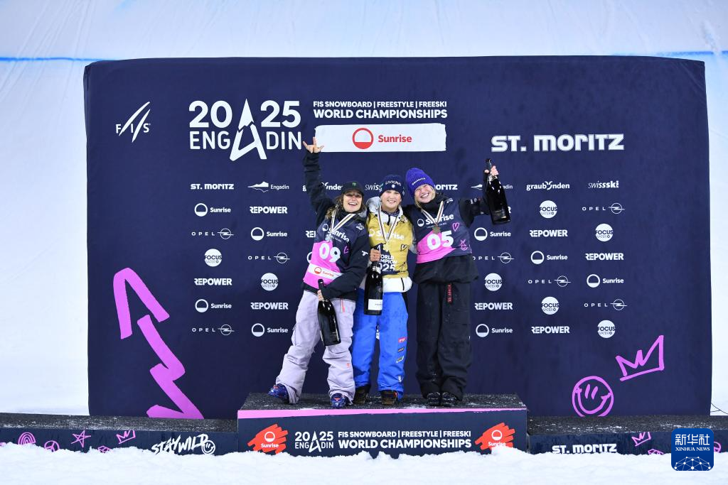 当日,2025年国际雪联世界单板滑雪和自由式滑雪锦标赛自由式滑雪女子大跳台决赛在瑞士圣莫里茨举行。