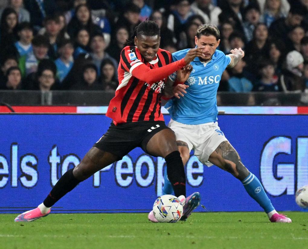 3月30日,那不勒斯队球员马佐基(右)与AC米兰队球员莱奥在比赛中拼抢。新华社发(阿尔贝托·林格利亚摄)
