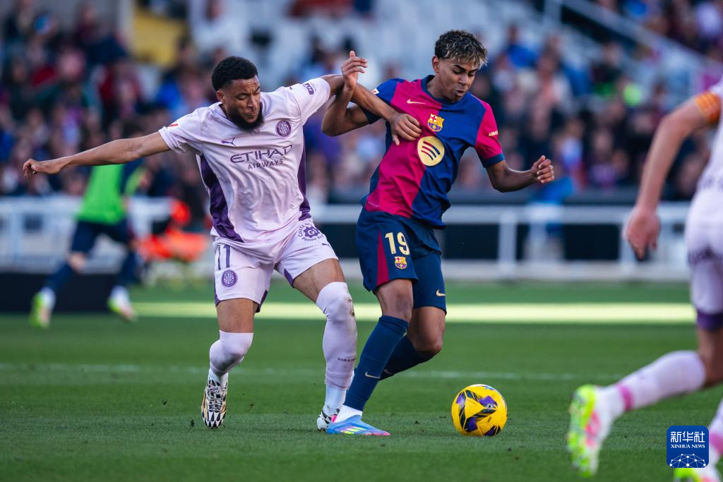 3月30日,巴塞罗那队球员亚马尔(右)和赫罗纳队球员丹朱马在比赛中拼抢。