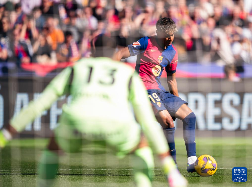 3月30日,巴塞罗那队球员亚马尔(右)在比赛中射门。