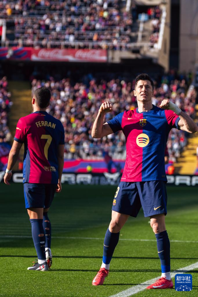 3月30日,巴塞罗那队球员莱万多夫斯基在比赛中庆祝进球。