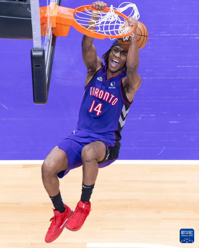 4月3日,猛龙队球员阿巴基(前)在比赛中扣篮。