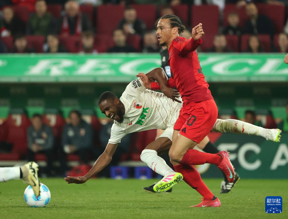 4月4日,奥格斯堡队球员奥涅卡(左)与拜仁慕尼黑队球员萨内在比赛中拼抢。