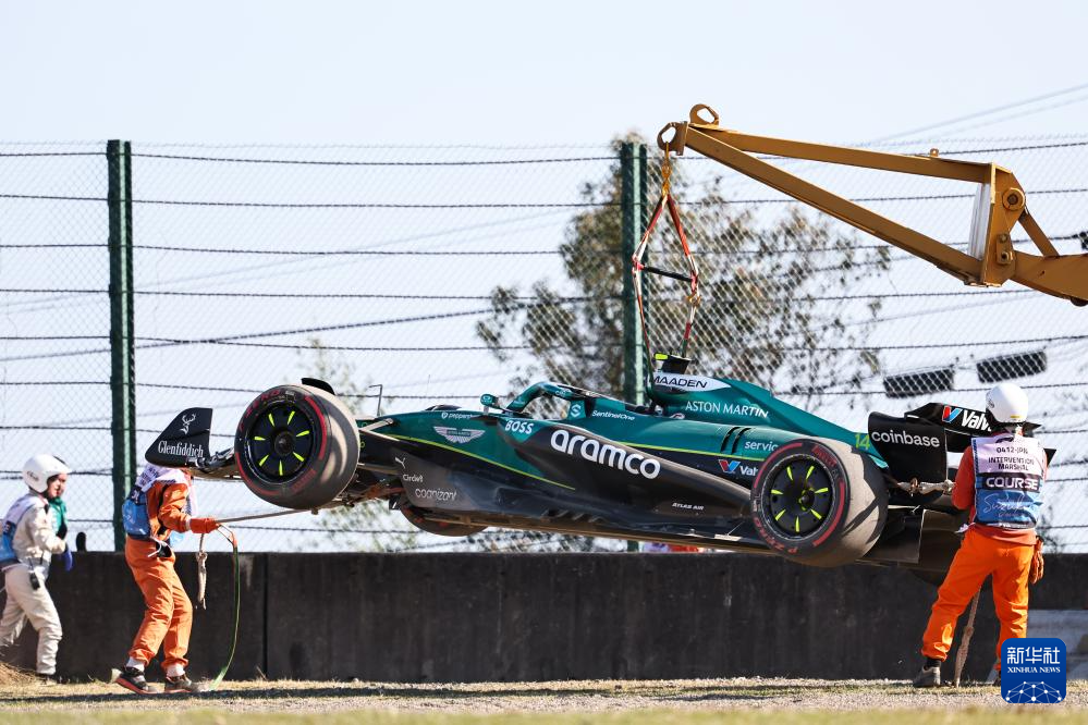 4月4日,工作人员在阿斯顿马丁车队西班牙车手阿隆索冲出赛道后清理现场。