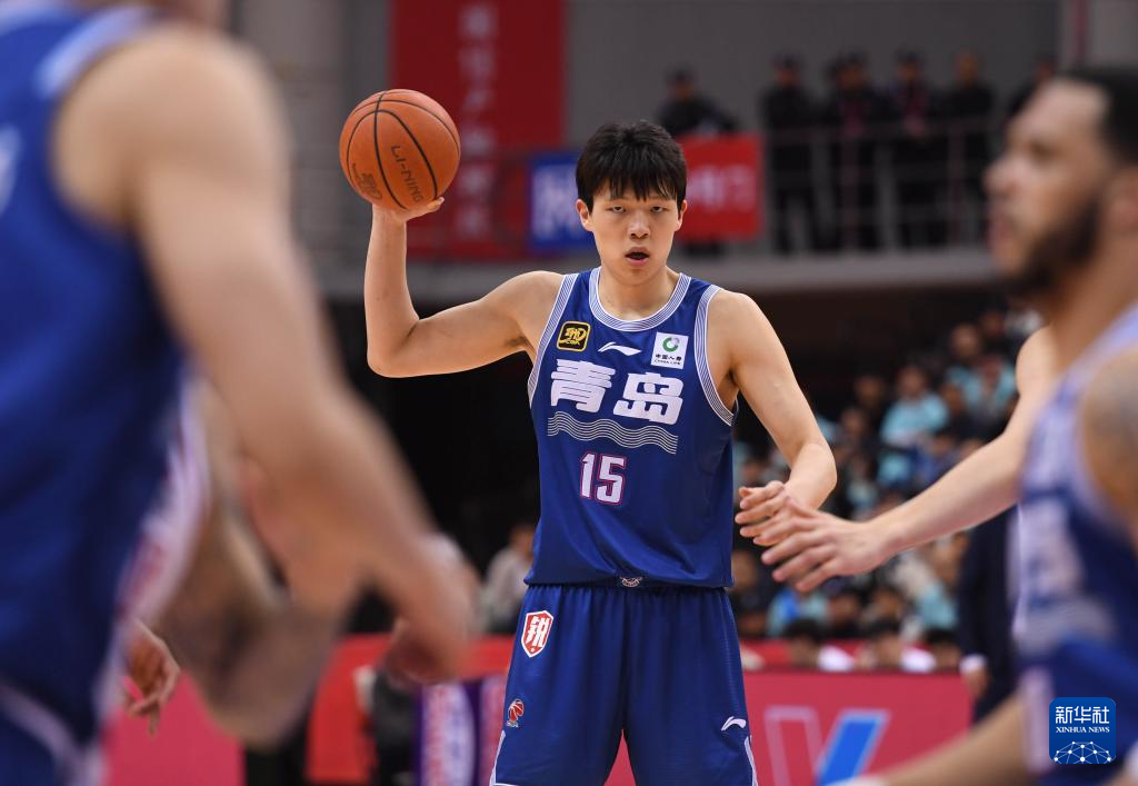4月4日,青岛国信制药队球员杨瀚森(中)在比赛中伺机传球。