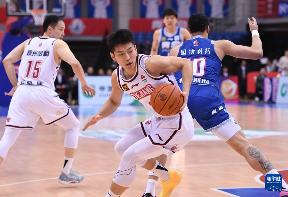 4月4日,浙江稠州金租队球员陆文博(前)在比赛中控球。