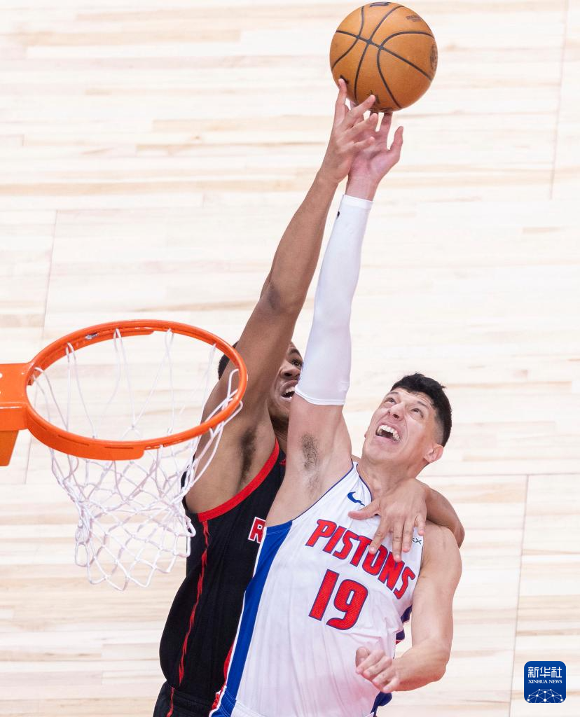 4月4日,猛龙队球员罗宾逊(左)与活塞队球员冯泰奇奥在比赛中争抢篮板球。