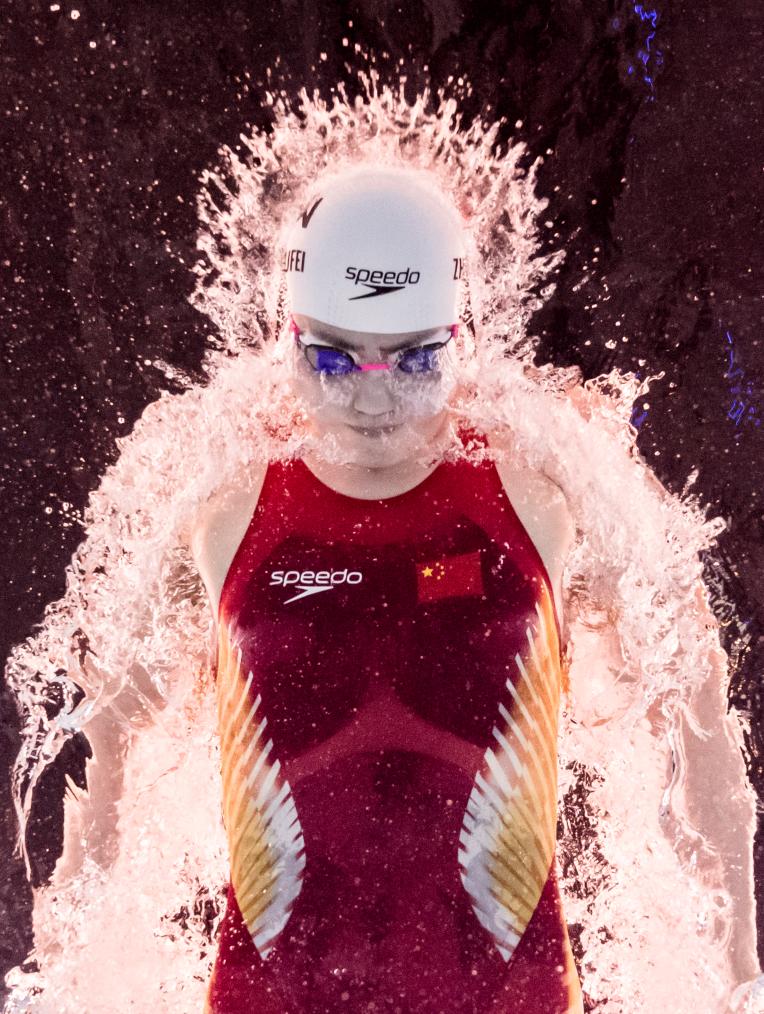 2024年8月3日,中国队第三棒选手张雨霏在巴黎奥运会游泳项目男女4x100米混合泳接力决赛中。