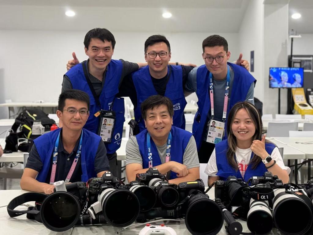 新华社巴黎奥运会游泳摄影团队王鹏、王毓国、薛宇舸(前排从左至右)、夏一方、杜宇、雒圆(后排从左至右)。