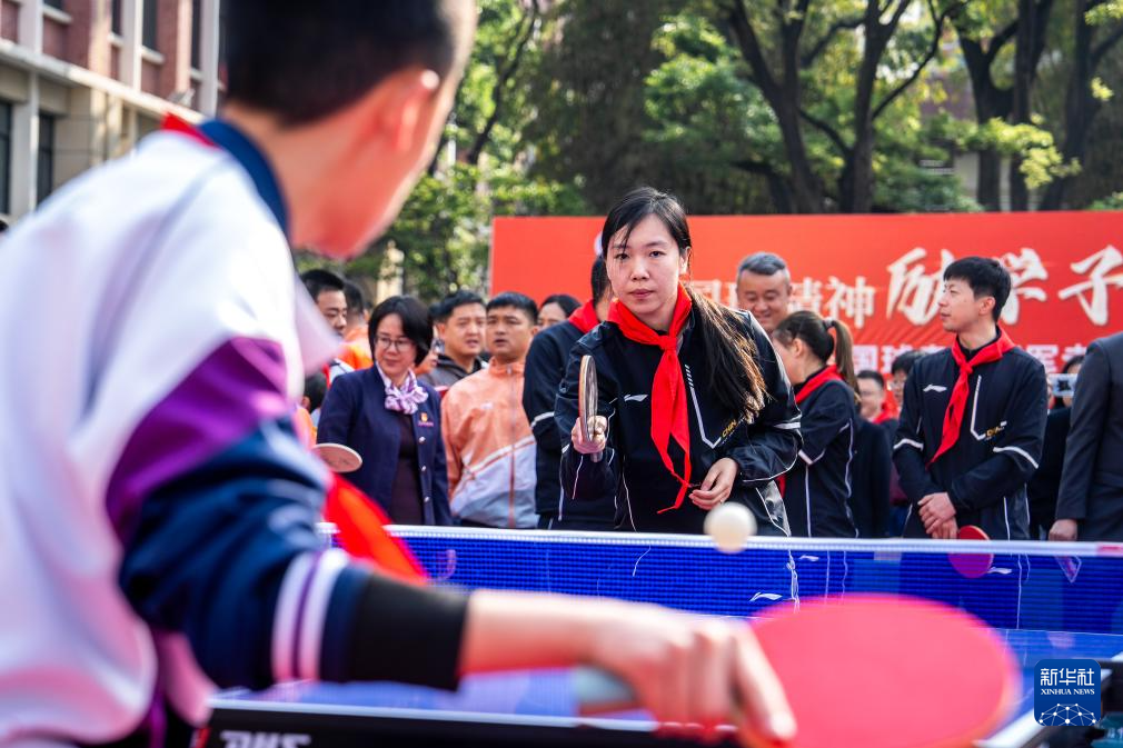 4月8日,李晓霞与云南师范大学实验中学学生进行乒乓球友谊赛。