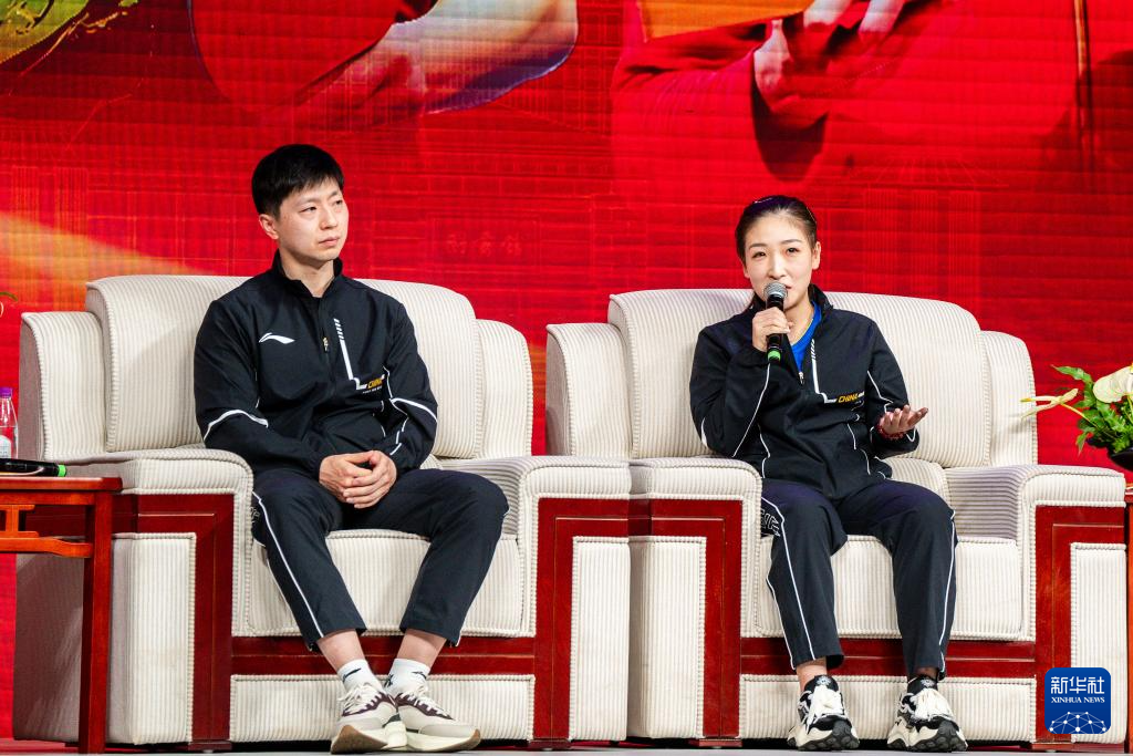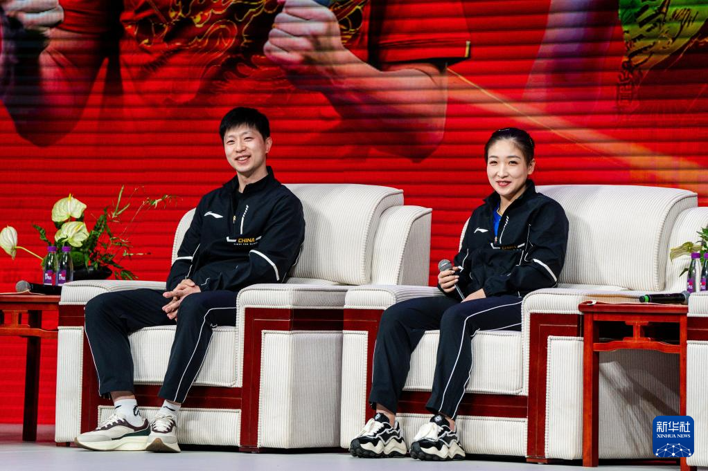 4月8日,马龙(左)和刘诗雯在交流活动上。