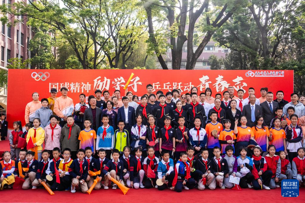 4月8日,马龙、许昕、刘诗雯、李晓霞在云南师范大学实验中学与参加活动的师生合影。