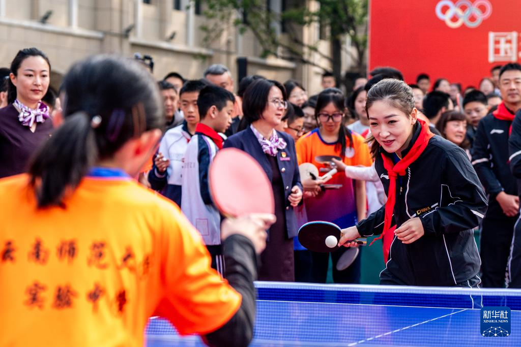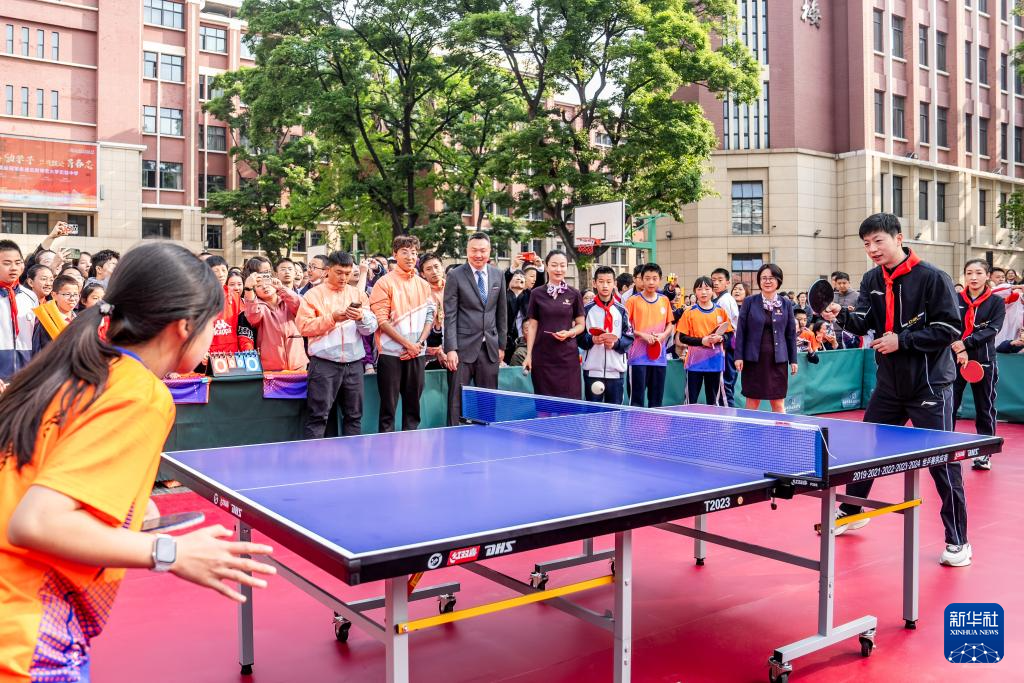 4月8日,许昕与云南师范大学实验中学学生进行乒乓球友谊赛。