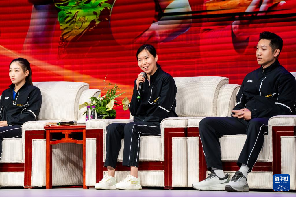 4月8日,马龙、刘诗雯、李晓霞、许昕(左二至右一)在交流活动上。