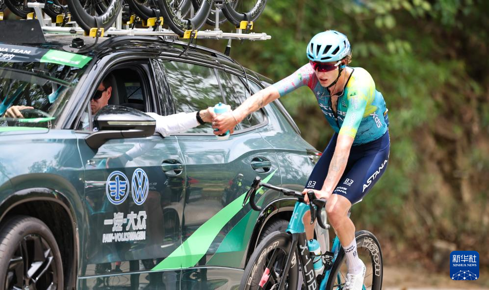 4月8日,喜德盛阿斯塔纳车队车手古斯塔夫·王在比赛中进行补给。