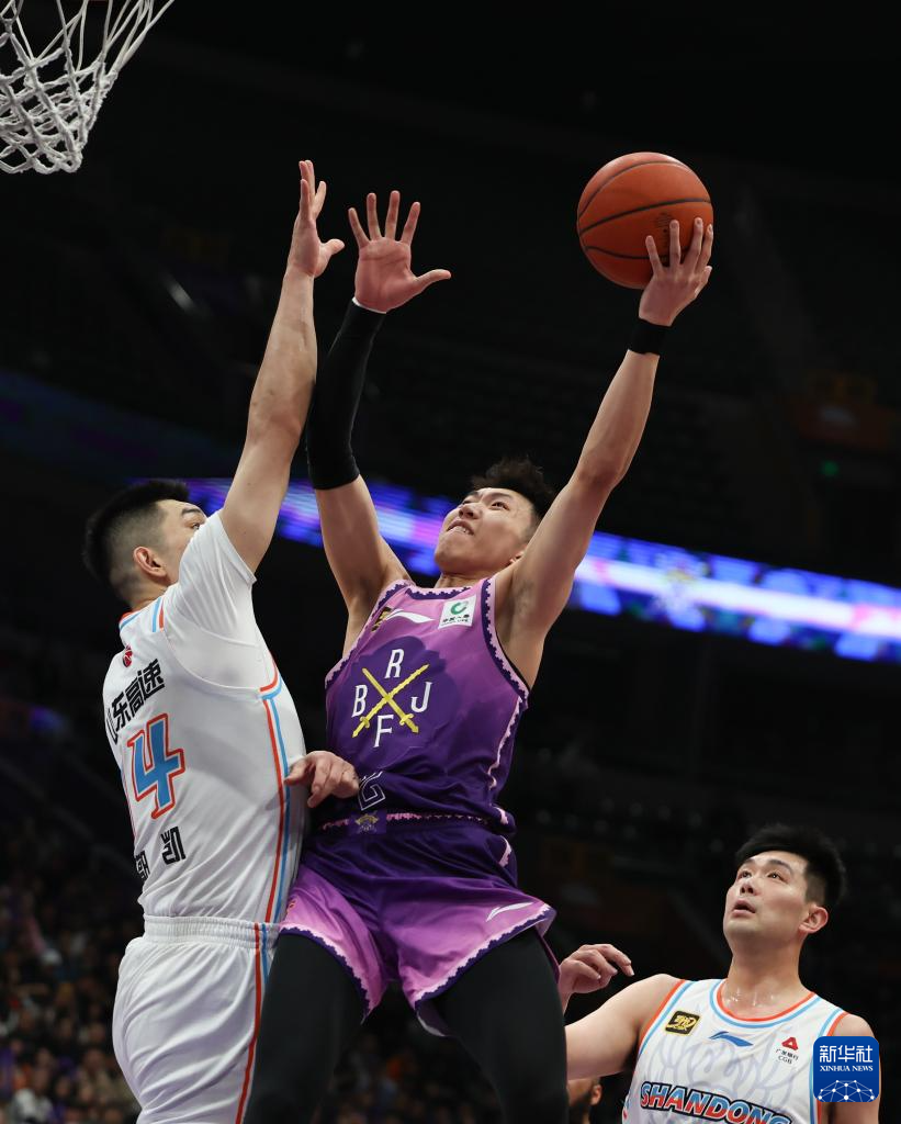 4月8日,北京控股队球员廖三宁(上右)在比赛中上篮。