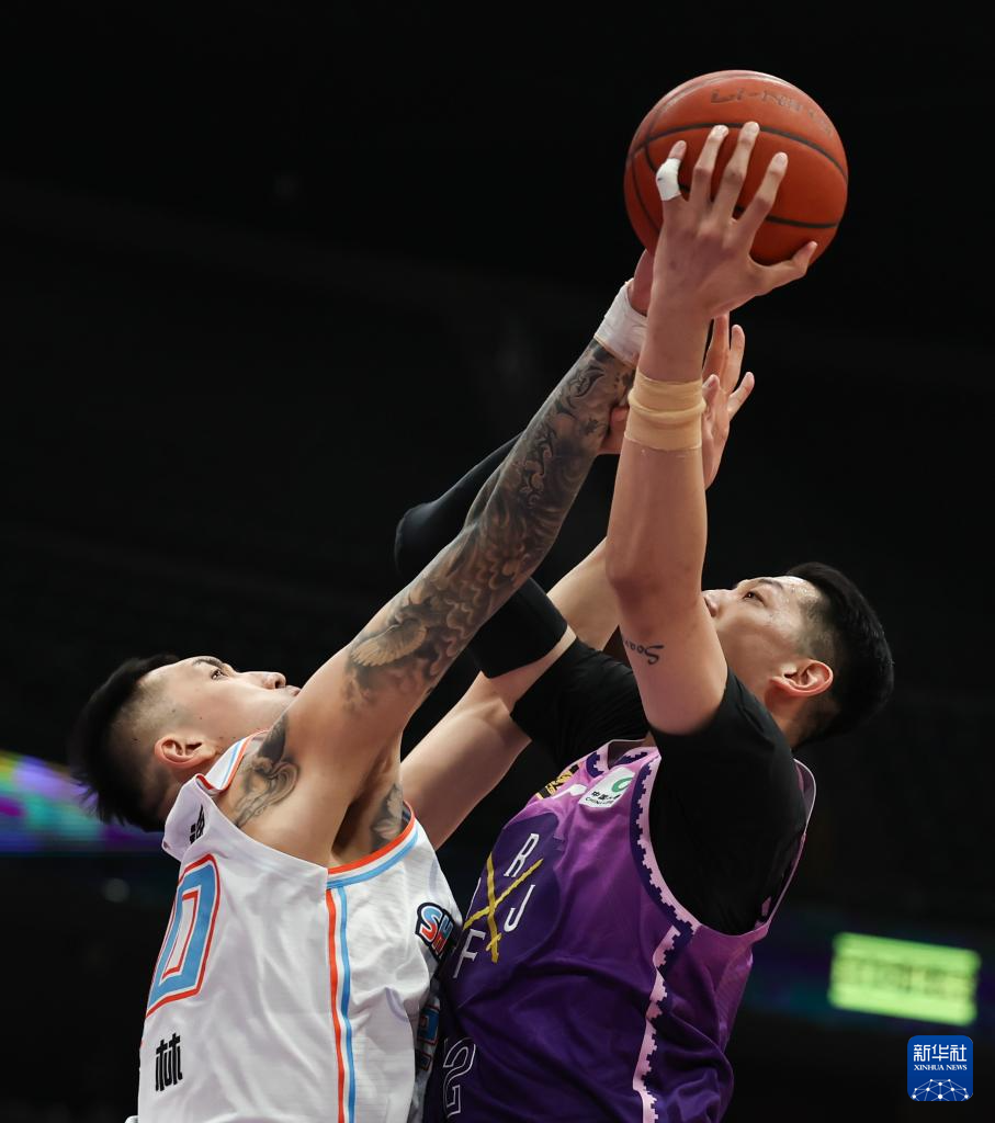 4月8日,北京控股队球员邹雨宸(上)和山东高速队球员高诗岩在比赛中拼抢。