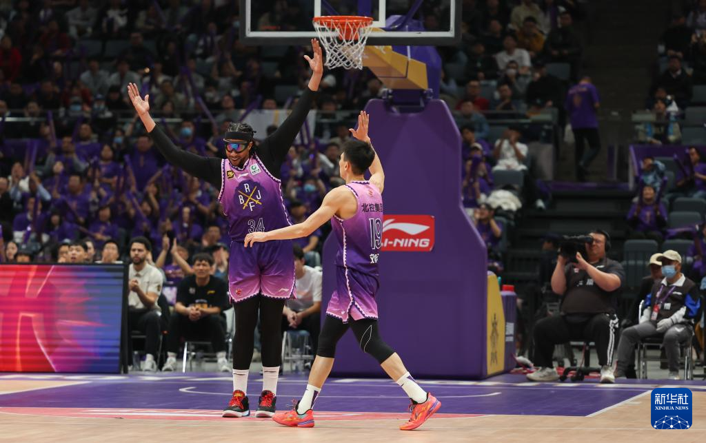 4月8日,北京控股队球员萨林杰(左)和队友刘晓宇在比赛中庆祝。
