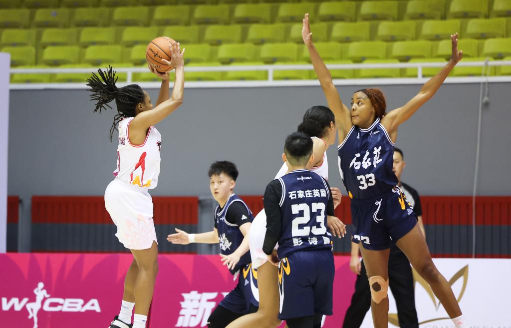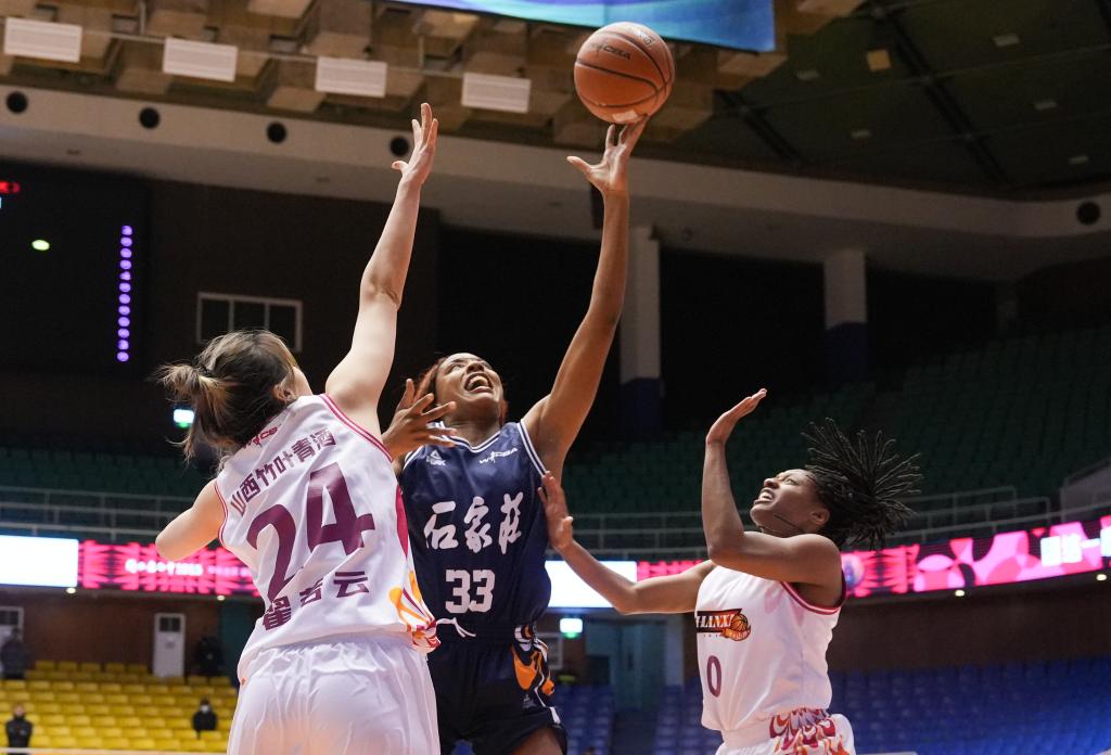 1月10日,在2024-2025赛季中国女子篮球联赛(WCBA)常规赛中,山西女篮球员翟若云正在防守石家庄队球员克里斯汀·奇奥马·安妮格威(中)。新华社发(梁子栋摄)