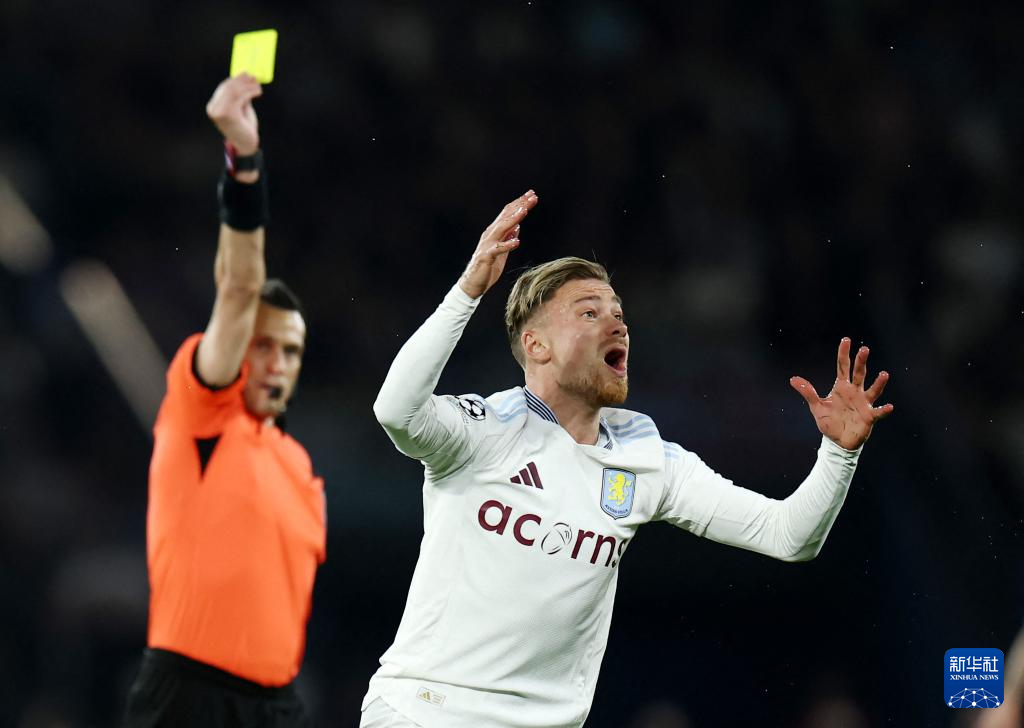 4月9日,阿斯顿维拉队球员卡什(右)在被出示黄牌后。