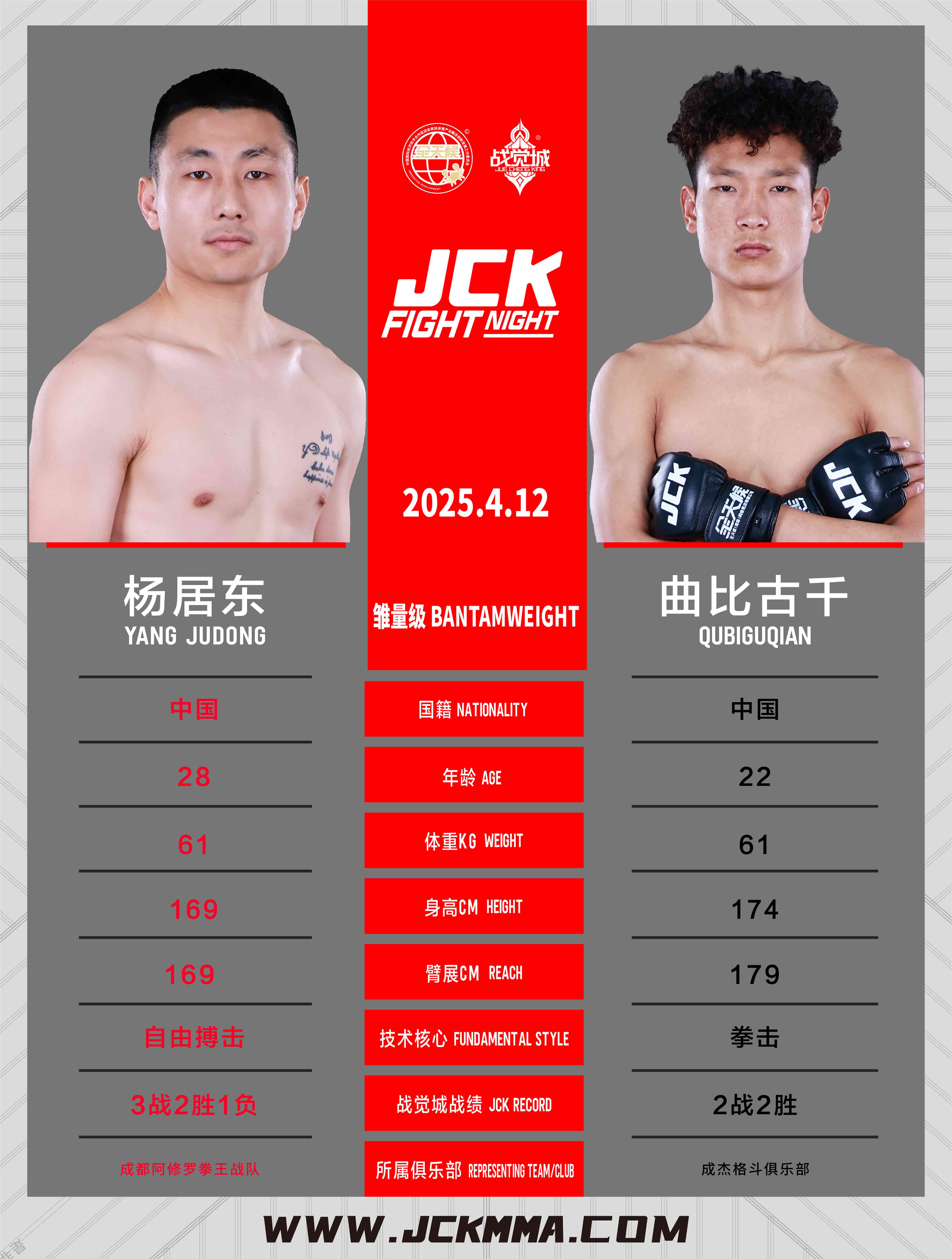 杨居东,年龄28岁,JCK觉城之夜N85四人新锐赛冠军,技术核心:自由搏击,在JCK战觉城3战2胜,曾一致判定战胜张宇、忍者绞降服李金洋。