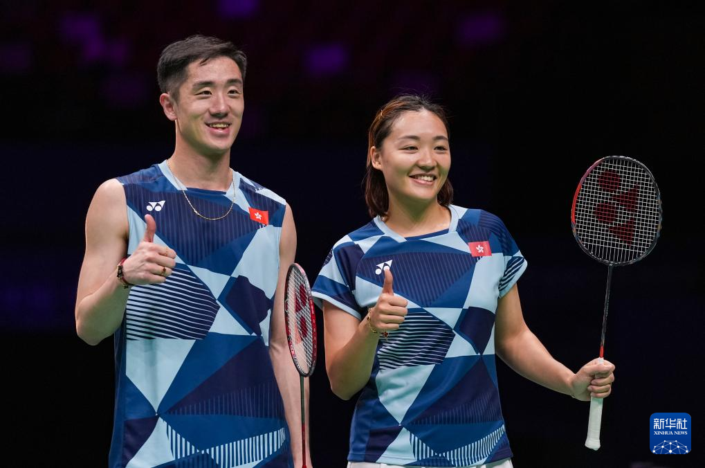 4月12日,邓俊文(左)/谢影雪在获胜后合影。新华社记者 孙非 摄