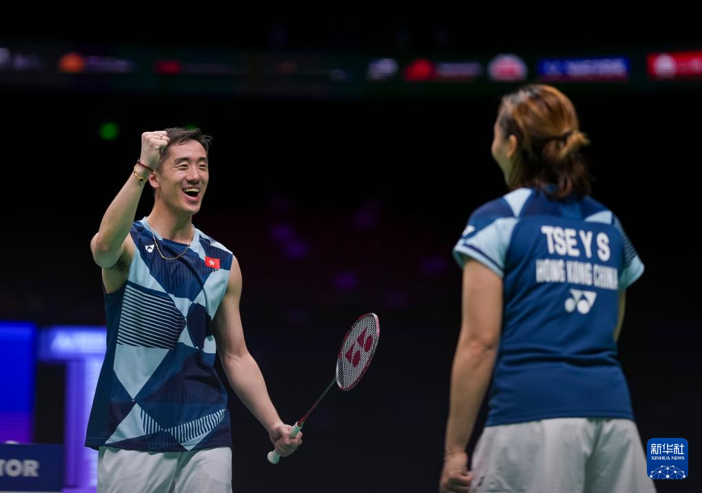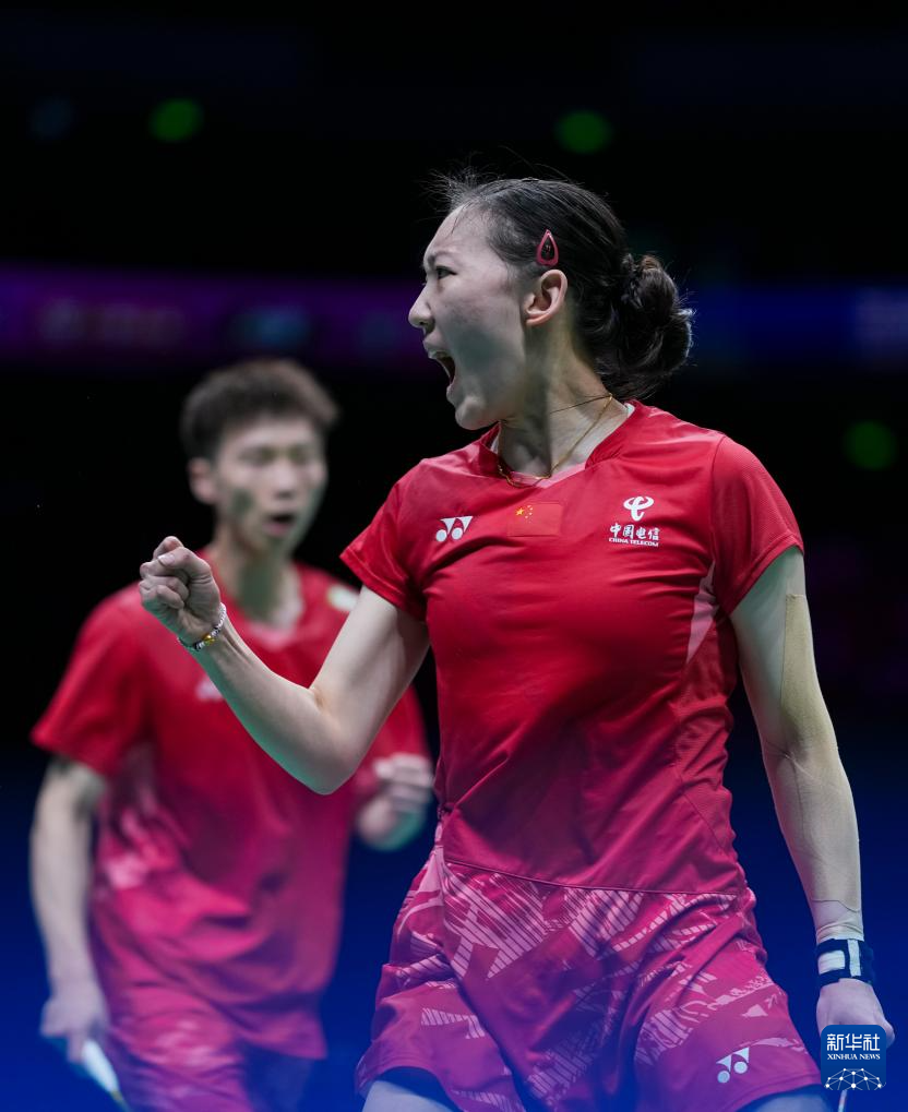 4月12日,邓俊文(左)/谢影雪在获胜后庆祝。新华社记者 孙非 摄