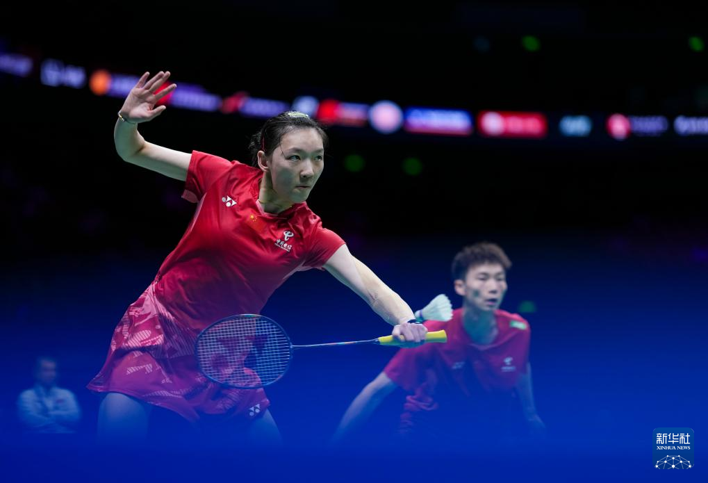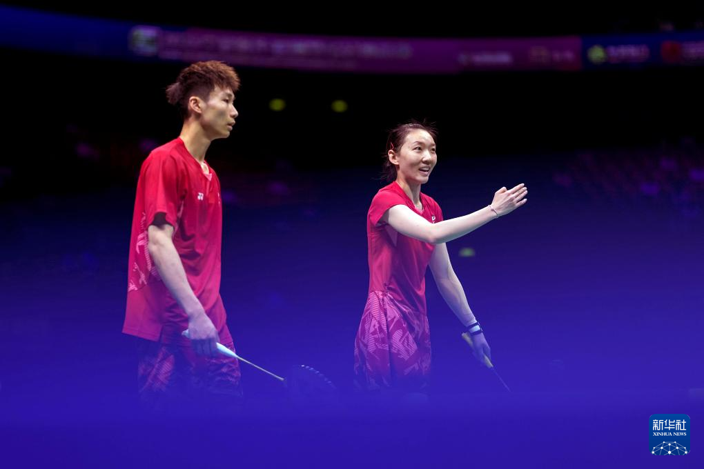 4月12日,邓俊文/谢影雪(左)在比赛中。新华社记者 孙非 摄
