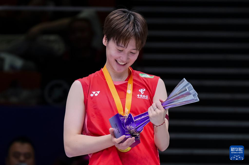 4月13日,陈雨菲在颁奖仪式上手捧奖杯。