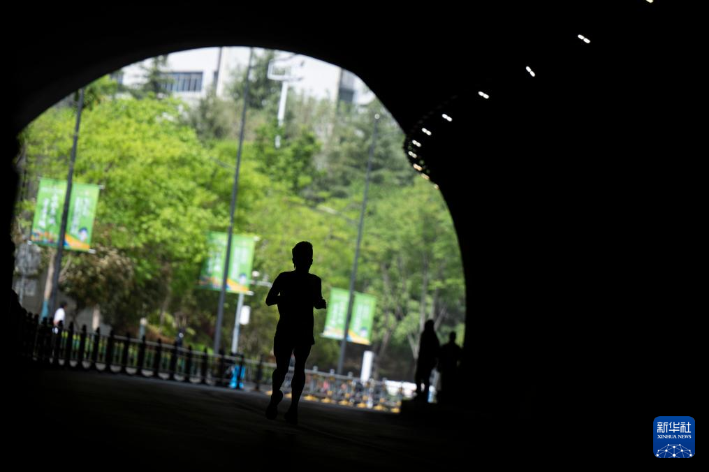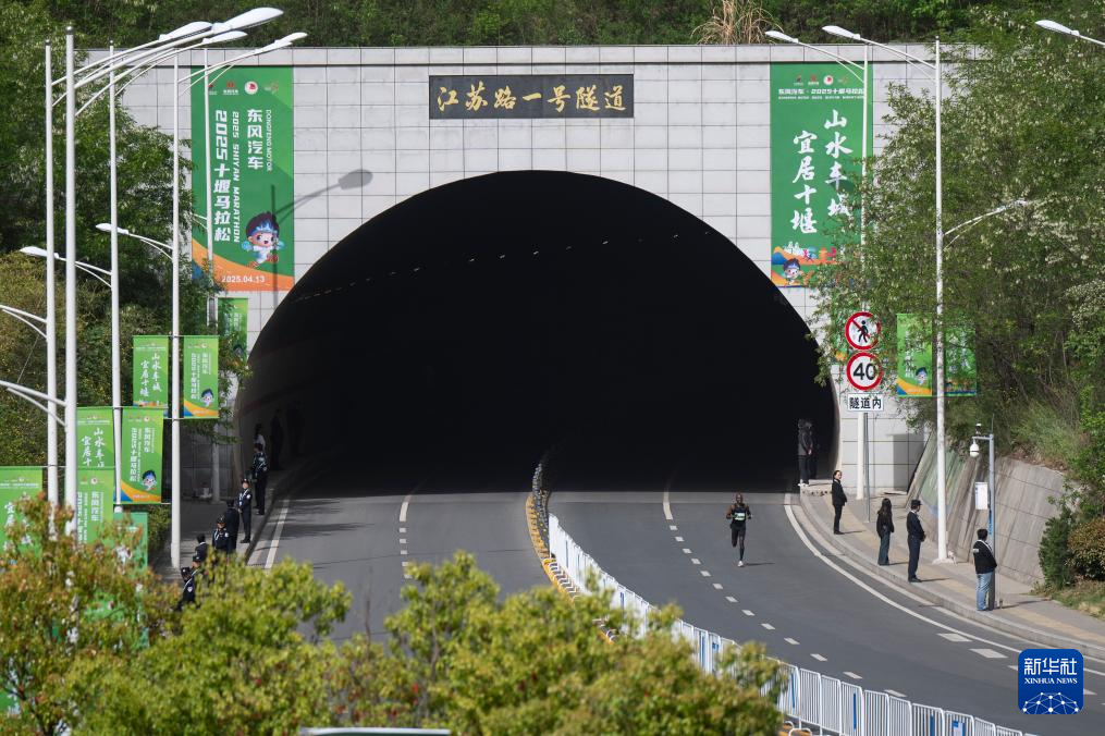 4月13日,一名参赛选手通过十堰市张湾区江苏路一号隧道。