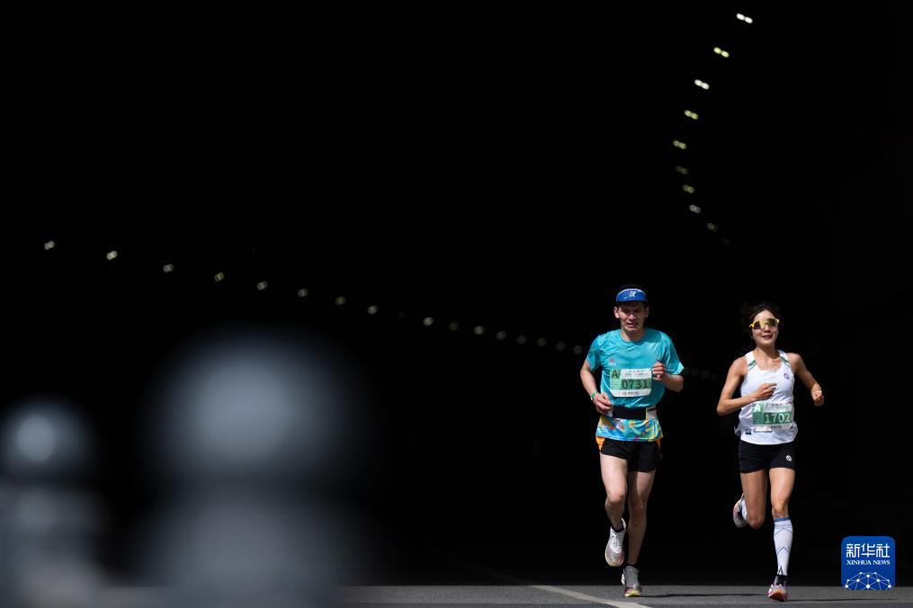 4月13日,两名参赛选手经过隧道。