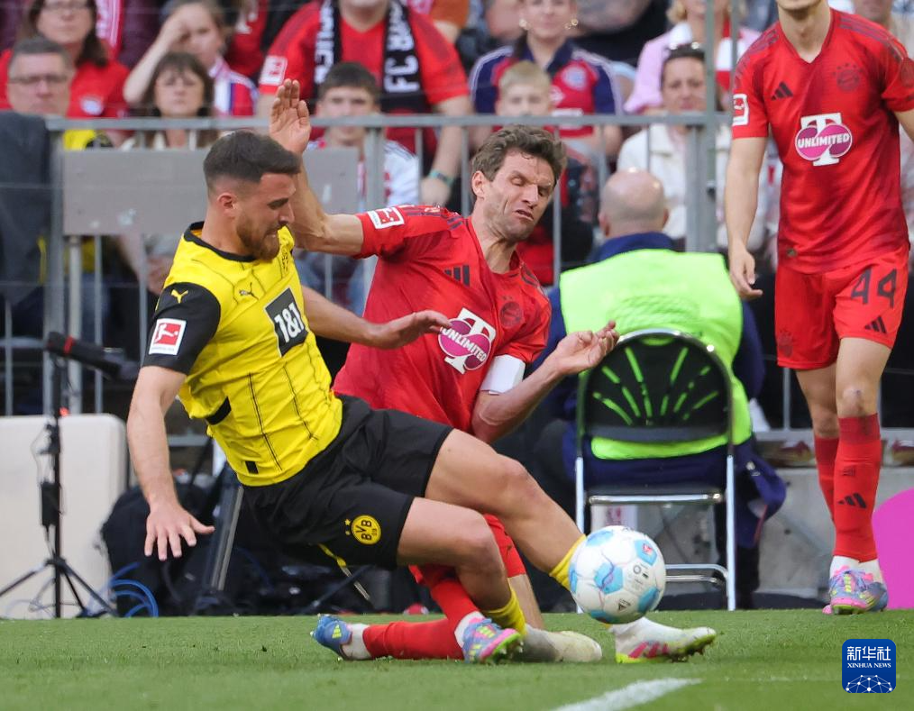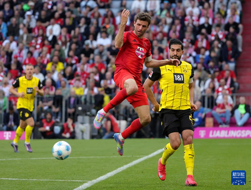 4月12日,拜仁慕尼黑队球员穆勒(左)与多特蒙德队球员埃姆雷·詹在比赛中拼抢。