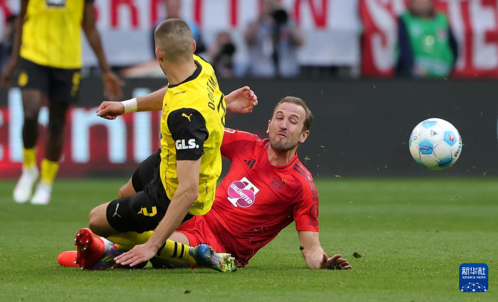 4月12日,拜仁慕尼黑队球员凯恩(右)与多特蒙德队球员安东在比赛中拼抢。