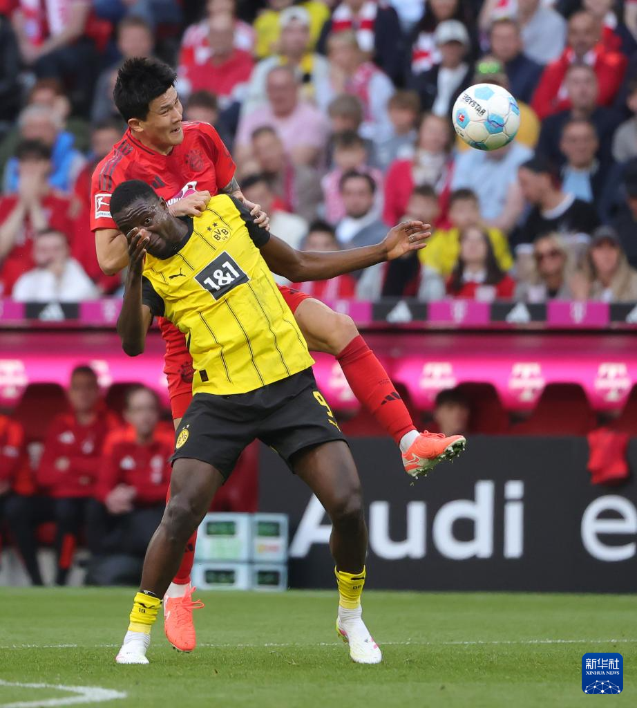 4月12日,拜仁慕尼黑队球员金玟哉(上)与多特蒙德队球员吉拉西在比赛中拼抢。