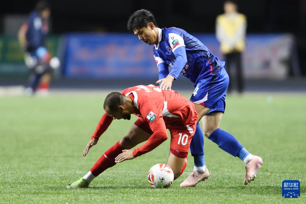 4月13日,石家庄功夫队球员马冲冲(右)与延边龙鼎队球员福布斯在比赛中拼抢。