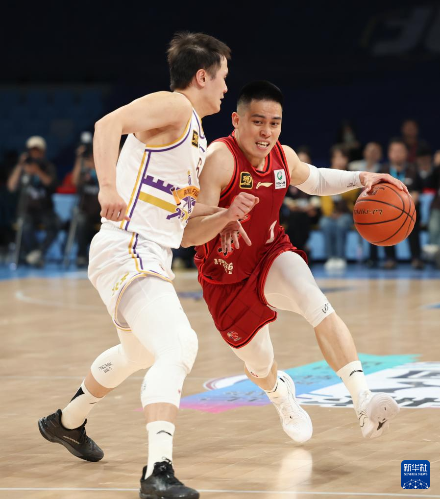 4月14日,北京北汽队球员陈盈骏(右)在比赛中面对北京控股队球员张帆的防守。