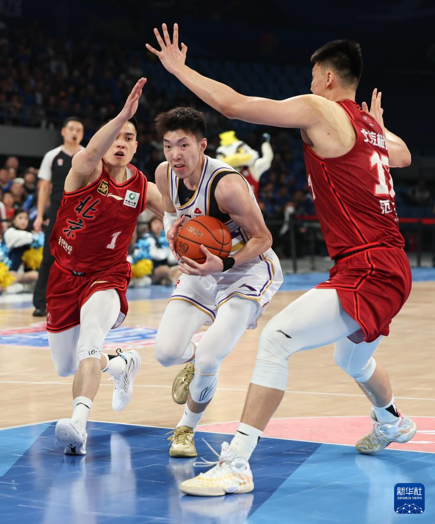 4月14日,北京控股队球员廖三宁(中)在比赛中突破。