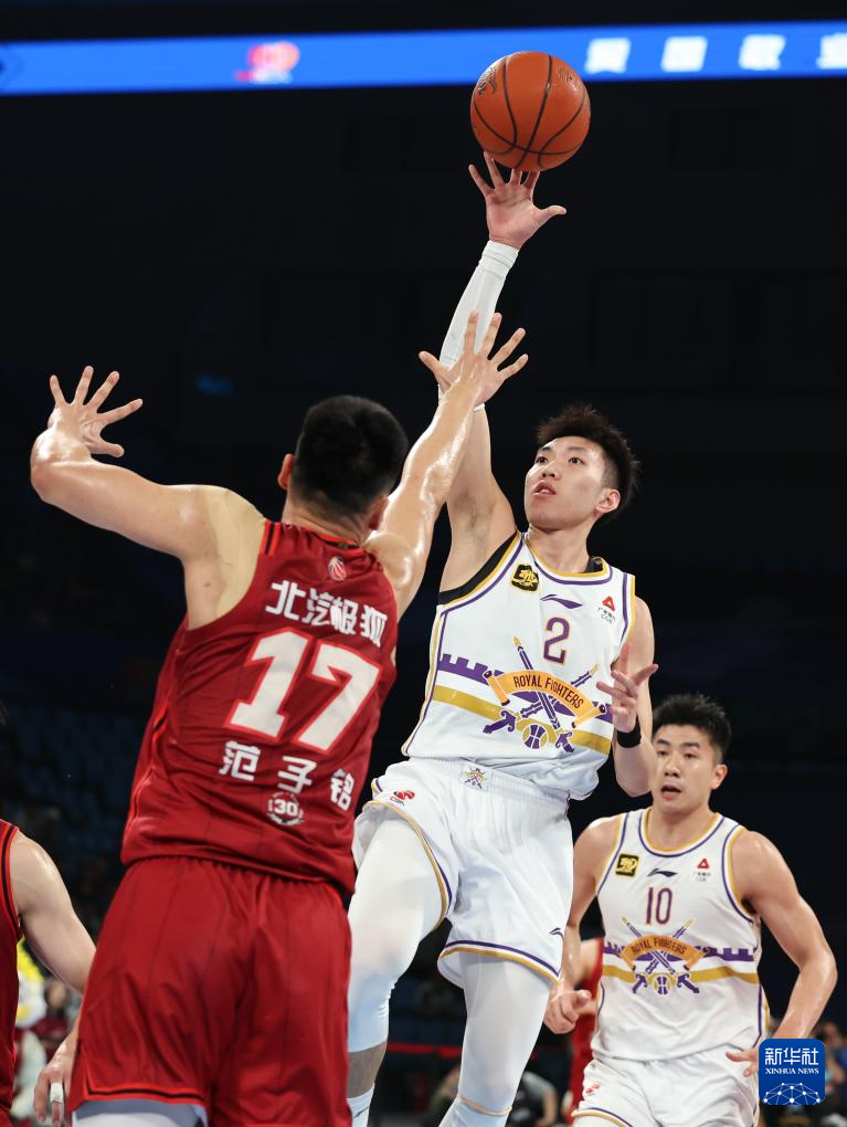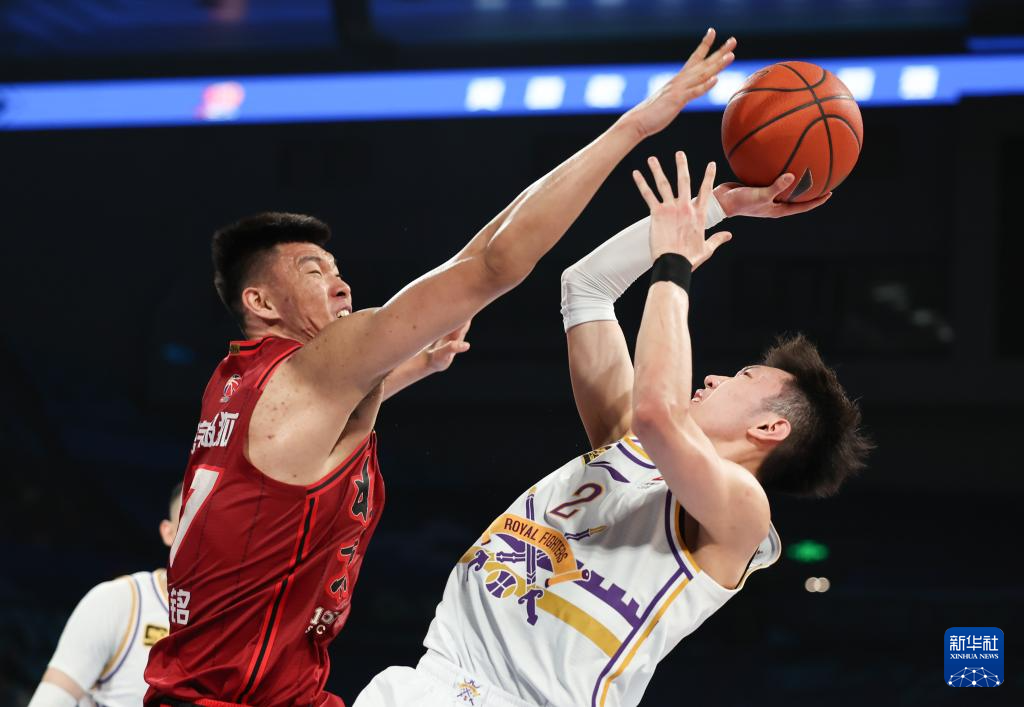 4月14日,北京控股队球员廖三宁(上右)在比赛中投篮。