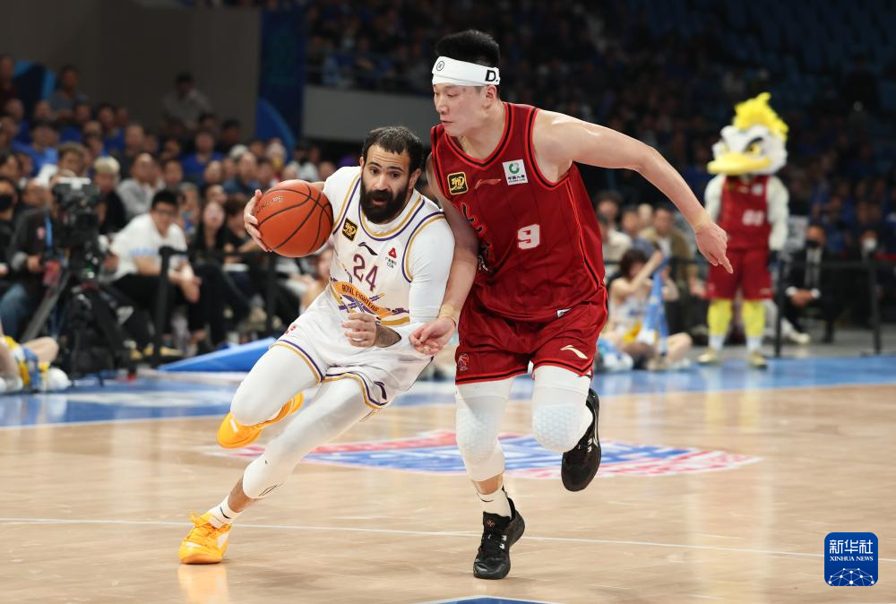 4月14日,北京控股队球员里勒(左)在比赛中突破。