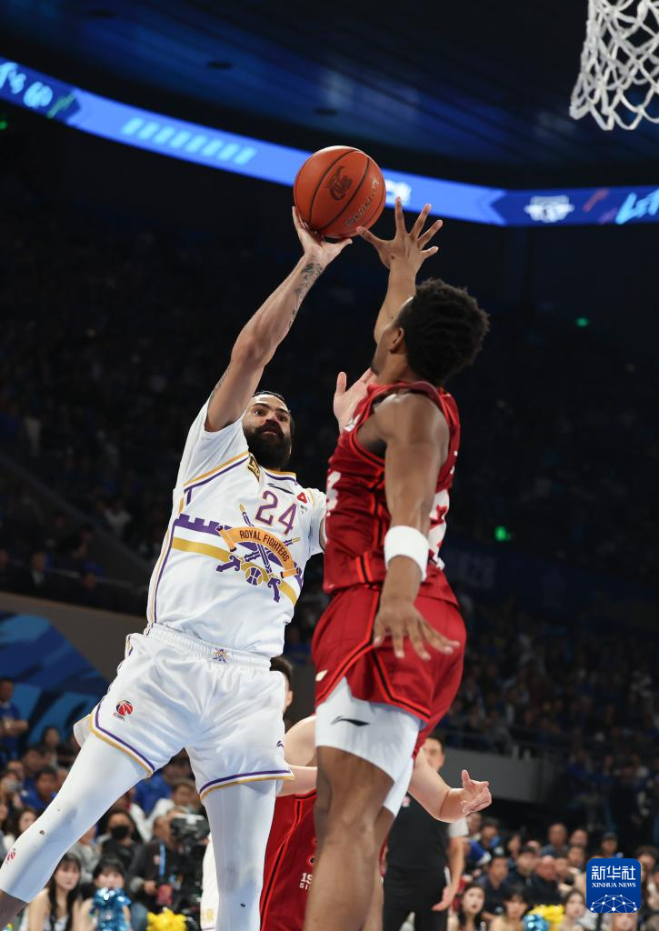 4月14日,北京控股队球员里勒(左)在比赛中投篮。