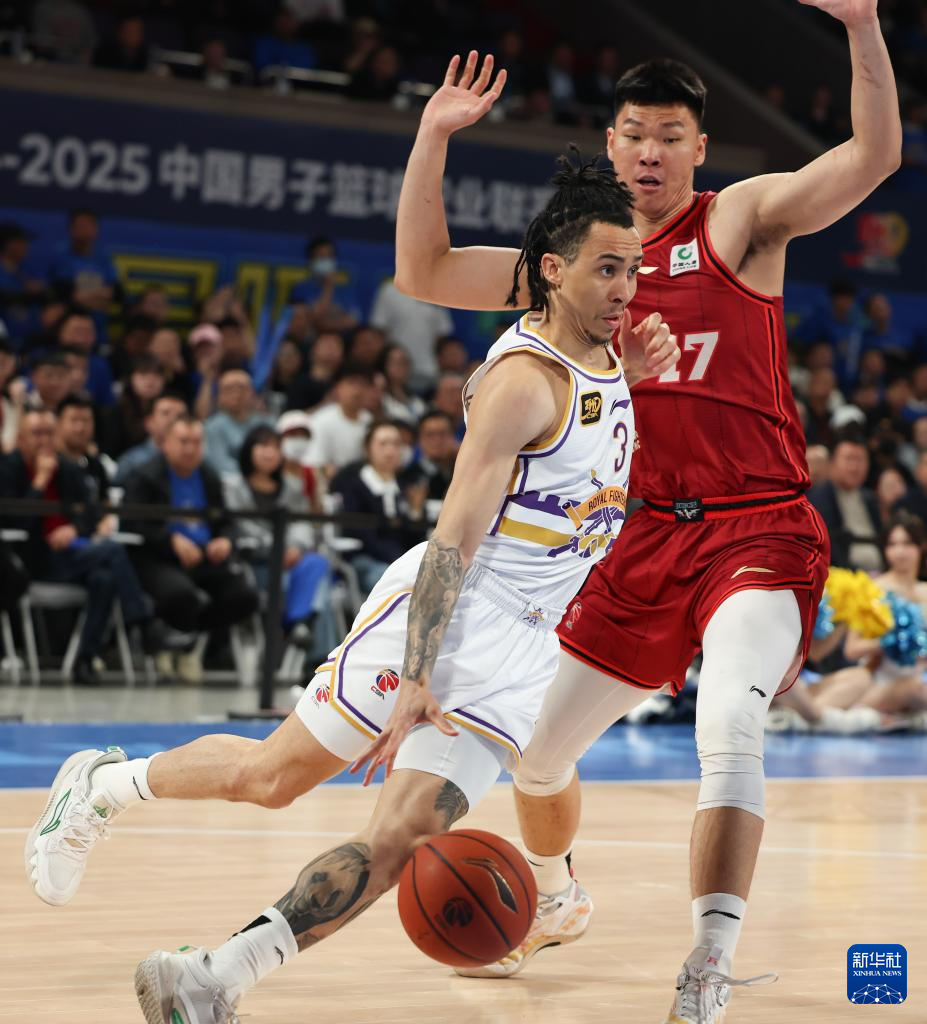 4月14日,北京控股队球员特莱斯(左)在比赛中突破。