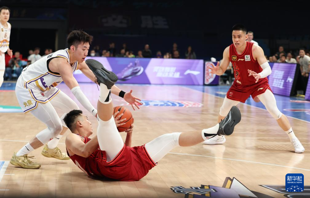 4月14日,北京北汽队球员翟晓川(中)在比赛中倒地拼抢。