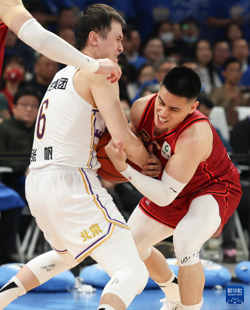 4月14日,北京北汽队球员陈盈骏(右)与北京控股队球员张帆在比赛中拼抢。