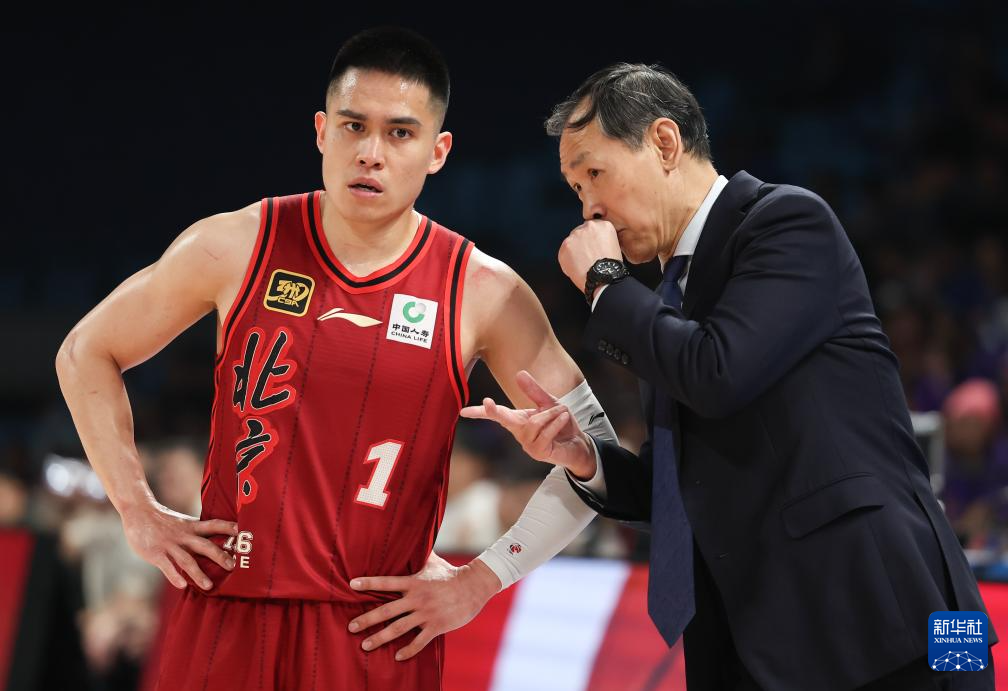 4月14日,北京北汽队主教练许利民(右)在比赛间隙指导球员陈盈骏。