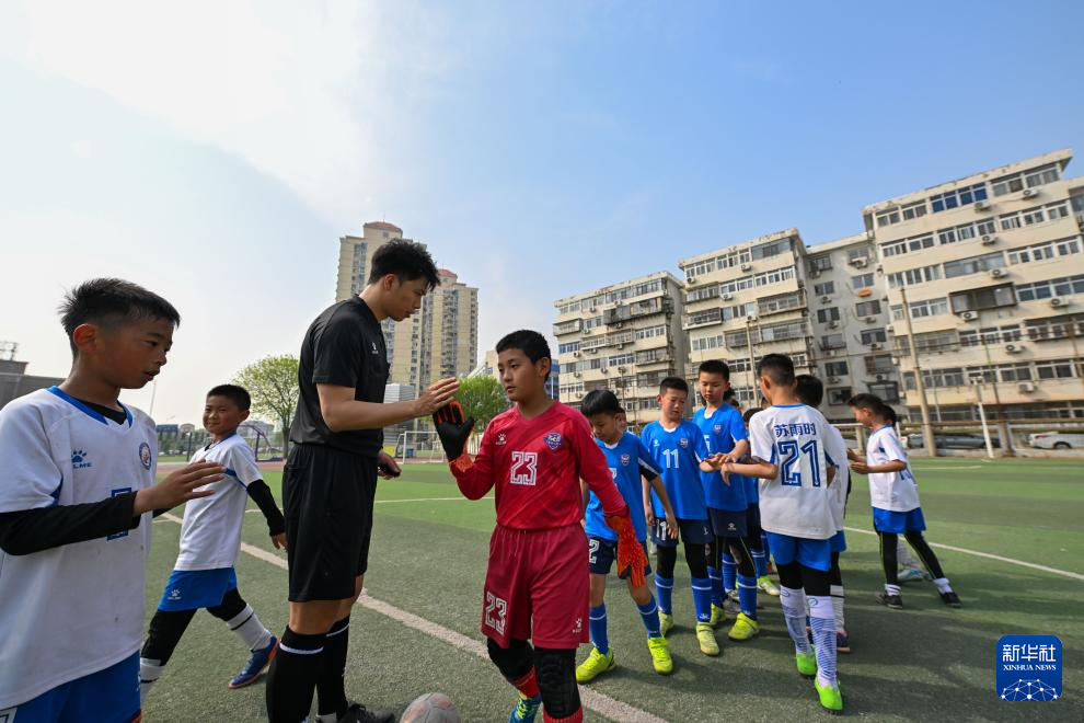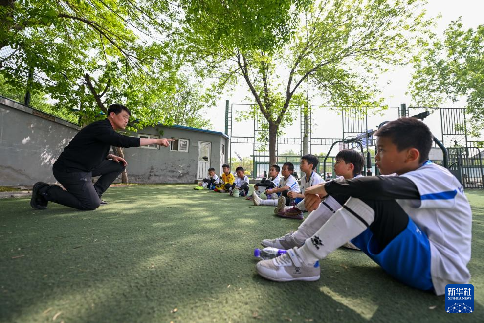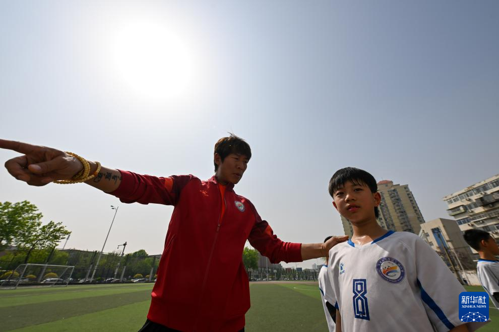 4月16日,天津市河西区土城小学教师刘建平(左)为学生进行中场指导。