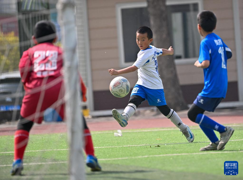 4月16日,天津市河西区土城小学队球员李泽铠(中)在比赛中射门。