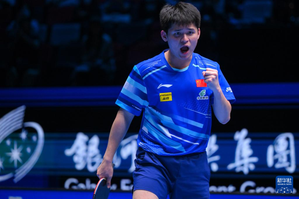 4月17日,林诗栋在比赛中庆祝得分。