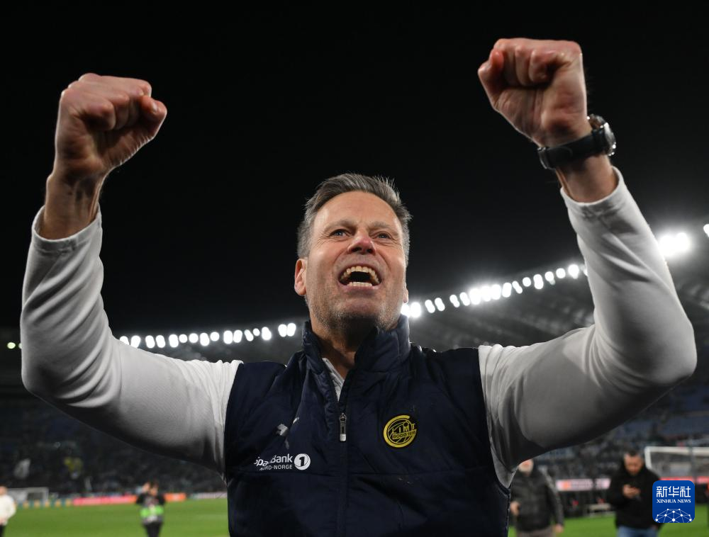 4月17日,博德闪耀队主教练克努森在赛后庆祝胜利。